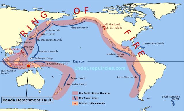 Lokasi Banda Detachment Fault di Indonesia bagian timur (bulatan merah) yang masuk dalam wilayah “Cincin Api” (Ring of Fire) atau “Lingkaran Cincin Api Pasifik” (The Pacific Ring of Fire).