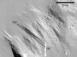 “Luka-luka” berupa garis-garis ini menunjukkan bahwa sepotong kerak yang lebih besar dari yang ada di Belgia atau Tasmania ini, pasti telah terpecah robek sepanjang 120 km sepanjang celah retakan dengan ekstensi dari sudut rendah, atau pelepasan patahan (detachment fault), untuk membentuk depresi permukaan laut yang akhirnya pada masa kini dapat terbentuk.