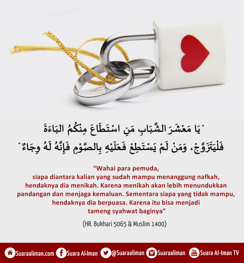 "Dan nikahkanlah orang-orang yang masih membujang di antara kamu, dan juga orang-orang yang layak (menikah) dari hamba-hamba sahayamu yang laki-laki dan perempuan. Jika mereka miskin, Allah akan memberikan kemampuan kepada mereka dengan karunia-Nya. Dan Allah Mahaluas (pemberian-Nya) lagi Maha Mengetahui." (Qs. an-Nur [24]: 32)