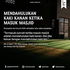 Artinya: "Termasuk sunnah ketika masuk masjid adalah mendahulukan kaki kanan. Dan jika keluar dengan mendahulukan kaki kiri." (HR Al-Hakim, 1: 218. Beliau berkata, "Sahih sesuai syarat Muslim", dan disetujui oleh Adz-Dzahabi)