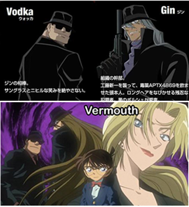 Mirip dengan tokoh antagonis dalam serial Detektif Conan dimana anggota organisasinya berpakaian serba hitam dan memiliki nama samaran yang diambil dari varian minuman keras seperti Vodka, Gin dan Vermouth.