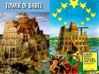 Suatu waktu, terbit sebuah poster resmi dari Gedung Uni Eropa yang entah dengan maksud apa menyandingkan gambar gedung Uni Eropa ini dengan Menara Babel dengan slogan-slogan yang sangat kental dengan suasana di era Nimrodz.