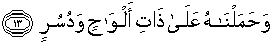 “ Dan Kami angkat Nuh ‘alaihissalam ke ats (bahtera) yang terbuat dari papan dan paku, yang berlayar dengan pemeliharaan Kami...sebagai balasan bagi orang-orang yang diingkari(Nuh) ..: QS Al qamar 13-14