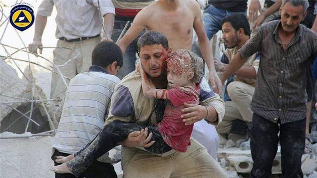 Sebuah bom rezim Assad dijatuhkan di daerah Anshari, Aleppo timur tahun 2014, dan membuat sejumlah warga terluka.