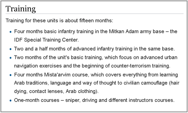 - 4 bulan: Pelatihan infanteri dasar di pangkalan militer Mitkan Adam – Pusat Pelatihan Khusus IDF.