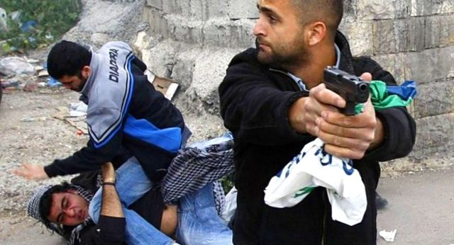 Seorang agen mata-mata dari Unit Mustaribin (kiri), menggunakan penutup wajah dan ikat kepala bendera Palestina sedang menggenggam pistol setelah berhasil menangkap seorang protester Palestina anti-Zionist Israel (kanan).