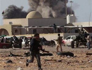 Saksi mata di timur kota itu mengatakan kepada AFP bahwa para pemberontak melancarkan serangan dalam upaya untuk mendapatkan kembali kontrol Ajdabiya, didukung oleh serangan udara atas mandat PBB yang diluncurkan pada hari Sabtu lalu oleh AS, Inggris, dan Perancis dalam upaya untuk melindungi warga sipil.