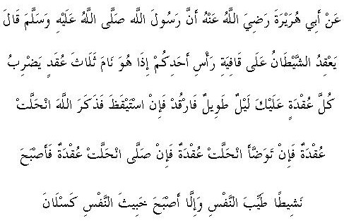 “Dari Abu Hurairah radhiyallahu ’anhu bahwa Nabi shollallahu ’alaih wa sallam bersabda: “Syetan akan mengikat tengkuk salah seorang di antara kamu apabila ia tidur dengan tiga ikatan. Syetan men-stempel setiap simpul ikatan atas kalian dengan mengucapkan: Bagimu malam yang panjang maka tidurlah. Apabila ia bangun dan berdzikir kepada Allah ta’aala maka terbukalah satu ikatan. Apabila ia wudhu, terbuka pula satu ikatan. Apabila ia sholat, terbukalah satu ikatan. Maka, di pagi hari ia penuh semangat dan segar. Jika tidak, niscaya di pagi hari perasaannya buruk dan malas.” (HR Bukhary 4/310)