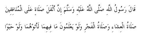 Bersabda Rasulullah shollallahu ’alaih wa sallam: “Sesungguhnya sholat yang paling berat bagi kaum munafik adalah sholat isya dan subuh (berjamaah di masjid). Andai mereka tahu apa manfaat di dalam keduanya niscaya mereka akan mendatanginya walaupun harus merangkak-rangkak. (HR Muslim 2/123)