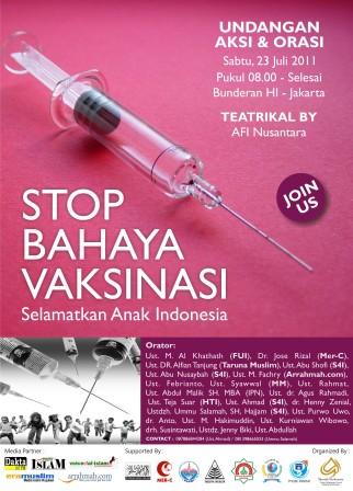 Untuk itu, Sharia4Indonesia-Divisi Pelayanan Umat Bidang Kesehatan-mengajak seluruh kaum Muslimin mendukung “Aksi & Orasi Stop Vaksinasi ; Selamatkan Anak Indonesia”, hari Sabtu (23/7/2011) di Bunderan HI, Jakarta. Acara akan dimulai pukul 08.30. Beberapa tokoh ormas Islam, praktisi serta ahli kesehatan sudah menyatakan kesediaannya untuk meramaikan acara ini. Mari kita selamatkan anak Indonesia dengan mengganti Program Vaksin yang rusak, dengan Program Tahnik dan bekam solusi sehat Metode Rasulullah SAW. Allahu Akbar!
