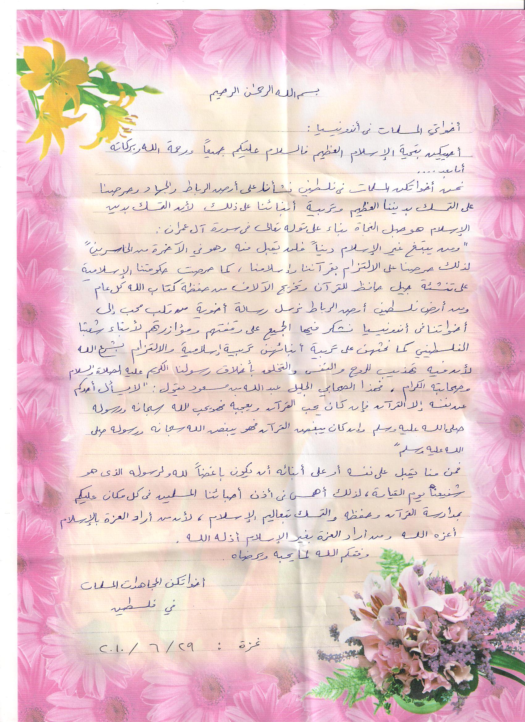 Dari bumi Palestina,medan ribath ini, kami mengirimkan surat persaudaraan dari lubuk hati yang dipenuhi cinta kepada saudari-saudari kami di Indonesia. Melalui surat ini, kami haturkan rasa terima kasih kepada semuanya atas sikap dan dukungan mereka untuk anak-anak bangsa Palestina kami.