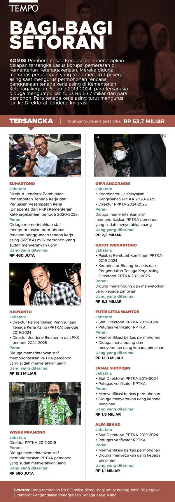 Salah satu tokoh kunci dalam kasus ini adalah Suhartono, mantan Dirjen Penempatan Tenaga Kerja, dan Haryanto, Dirjen periode setelahnya. Keduanya, bersama dua pejabat lain — Wisnu Pramono dan Devi Anggraeni, diduga menjadi atasan yang memberi perintah kepada tiga operator lapangan: Putri Citra Wahyoe, Jamal Shodiqin, dan Alfa Eshad.