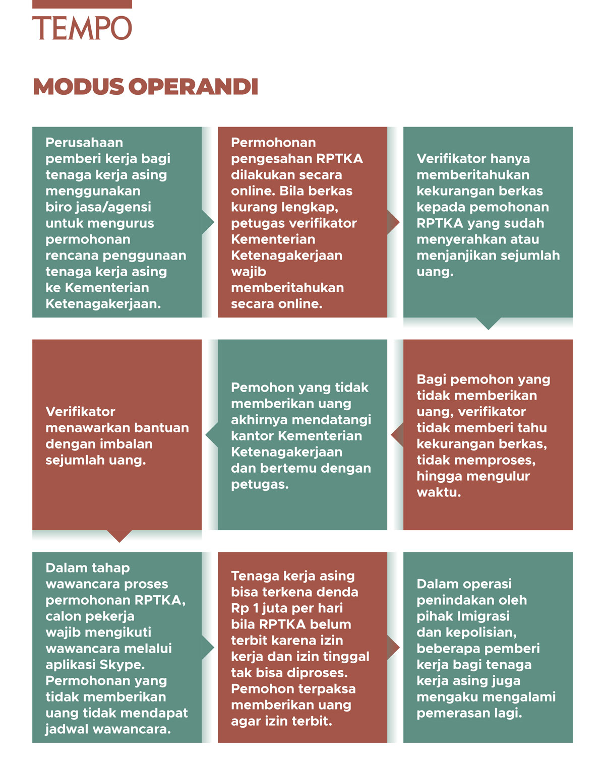 Modus yang digunakan antara lain: mengulur-ulur proses izin, meminta uang sebagai “syarat percepatan”, dan menyampaikan pesan bahwa dokumen permohonan belum lengkap sebagai isyarat untuk menyetor uang. Tarifnya bervariasi, mulai dari Rp 1 juta per permohonan, bahkan lebih tinggi tergantung jumlah tenaga kerja asing yang diajukan.