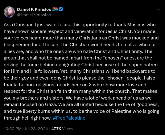 "Saya juta berterima kasih kepada teman-teman non-religius di X (sebelumnya Twitter), yang menunjukkan lebih banyak cinta dan rasa hormat terhadap iman Kristen dibandingkan banyak orang di gereja. Itu membuat anda menjadi saudara dan saudari saya. Kita memiliki banyak pekerjaan di depan kita saat kita tetap fokus pada Gaza. Masih banyak yang harus kita kerjakan sambil terus fokus pada Gaza. Kita semua bersatu karena api kebaikan dan kebebasan sejati membara dalam diri kita, untuk menjadi suara Palestina yang sedang menderita saat ini," tulisnya.