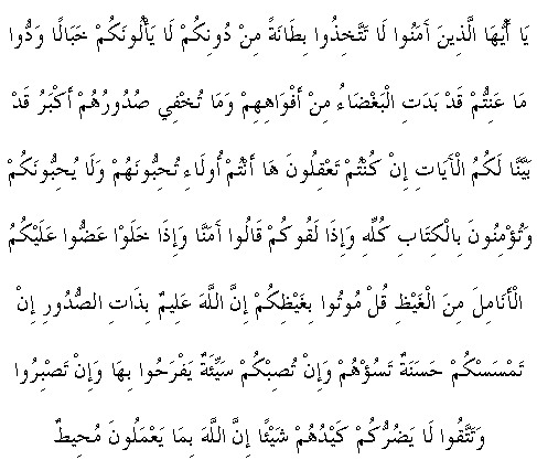 ”Hai orang-orang yang beriman, janganlah kamu ambil menjadi teman kepercayaanmu orang-orang yang di luar kalanganmu (karena) mereka tidak henti-hentinya (menimbulkan) kemudharatan bagimu. Mereka menyukai apa yang menyusahkan kamu. Telah nyata kebencian dari mulut mereka, dan apa yang disembunyikan oleh hati mereka lebih besar lagi. Sungguh telah Kami terangkan kepadamu ayat-ayat (Kami), jika kamu memahaminya.