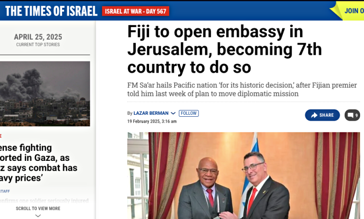 Dalam pemberitaan The Times of Israel, dikatakan "Fiji akan Membuka Kedutaan Besar di Yerusalem, Tujuh Negara Lain akan Mengikuti" (19/2).