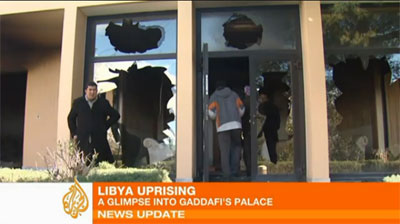 Pada saat demonstran pro-demokrasi memegang kendali beberapa kota di Libya bagian timur, banyak properti milik Muammar Gaddafi di jarah oleh para demonstran dan bahkan dihancurkan.