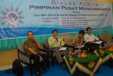 Imam Tholhah (Direktur PAIS Kementerian Agama) didampingi Supriyoko (Taman Siswa, kiri), Slamet Efendi (moderator, kedua dari kanan) dan Imron Hanafi (Wakil Sekretaris Majelis Dikdasmen Muhammadiyah, kanan) saat berbicara pada dialog publik dengan tema "Ujian Sekolah Berstandar Nasional Pendidikan Agama Islam(USBN PAI)" di gedung dakwah PP Muhammadiyah jalan Menteng Raya 62, Jakarta Pusat pada Selasa (19/4). Acara ini juga sebagai bentuk sosisalisasi untuk ujian sekolah dalam mata pelajaran agama secara nasional. (mzs)
