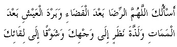 “Ya Allah, aku mohon ridho (dalam hatiku) sesudah keputusanMu, kesejukan hidup setelah kematian, kelezatan memandang wajahMu dan kerinduan berjumpa denganMu.”