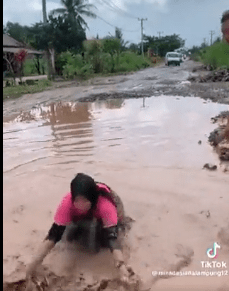 Tak sampai di situ, sang emak-emak yang mengenakan sarung ini langsung menceburkan diri dengan keras ke arah lubang jalan. Ia juga tampak duduk sambil mengepak-kepakan air dalam genangan lubang itu dengan tangan saking jengkelnya.