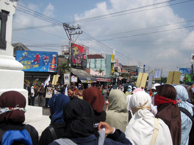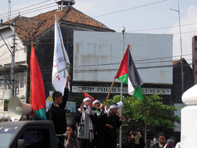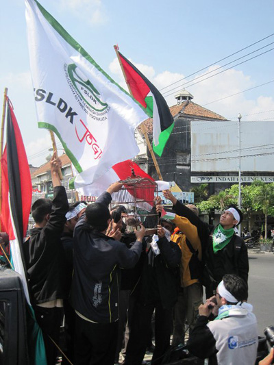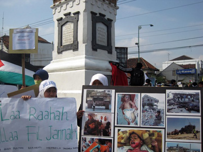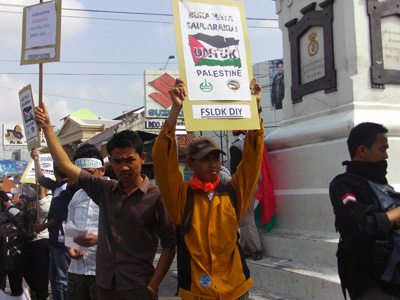 Setelah berdo’a bersama-sama untuk kelancaran kegiatan, masa aksi bergerak menuju Tugu Jogja. Dalam perjalanan para mahasiswa membagikan artikel tentang Palestina dan juga melakukan penggalangan dana. Berbagai atribut dan foto2 kekejian zionis Yahudi ditunjukkan kepada masyarakat Yogayakarta. Aksi ini juga bertepatan dengan kedatangan SBY di Yogyakarta. Arif Nurhayanto (mahasiswa UGM) yang merupakan Koordinator BK Isu Dunia Islam FSLDK Indonesia kepada wartawan juga menyindir tentang pemerintahan SBY yang seakan tidak peduli dengan kondisi Palestina saat ini. Padahal Indonesia punya hutang budi sejarah kepada Palestina. Dia mengajak masyarakat Jogja untuk membuktikan bahwa kita peduli dengan rakyat Palestina. Sebagaimana rakyat Palestina yang juga peduli dengan mengirimkan bantuan kepada warga Yogyakarta saat erupsi gunung Merapi.