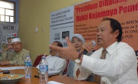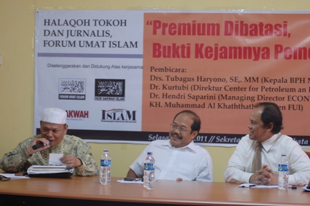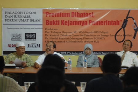 Menyikapi kebijakan Pemerintah terkait pembatasan BBM jenis premium, Forum Umat Islam (FUI) pada Selasa (7/6) siang menggelar Halaqoh Tokoh dan Jurnalis dengan tema: “Premium Dibatasi, Bukti Kejamnya Pemerintah”, dengan menghadirkan pembicara Kurtubi (Pengamat Perminyakan), Hendri Saparini (Direktur Econit), Hasyim (Komite Migas) dan Muhammad AlKhaththath (Sekjen FUI).