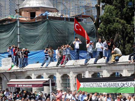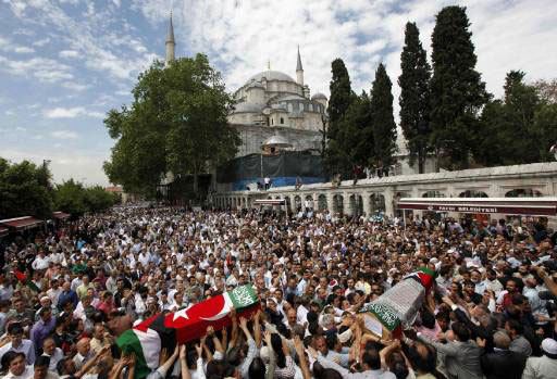 Puluhan ribu pelayat berbondong-bondong pada hari Kamis kemarin (3/6) ke masjid Fatih untuk menghormati para aktivis kemanusiaan Turki yang tewas dalam serangan Israel pada armada bantuan.