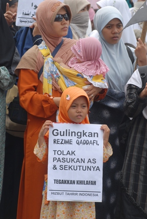 Menyikapi gejolak yang terjadi di Timur Tengah, khususnya Libya, siang tadi (28/3) Hizbut Tahrir Indonesia (HTI) melakukan aksi unjuk rasa terhadap kesewenangan Khaddafi dan menolak Invasi Militer yang dilakukan tentara koalisi pimpinan AS.
