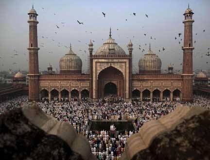 Umat Islam India melangsungkan shalat Idul Adha di Masjid Jama, salah satu masjid terbesar di New Delhi. Muslim di sana berlebaran pada tanggal 17 November.