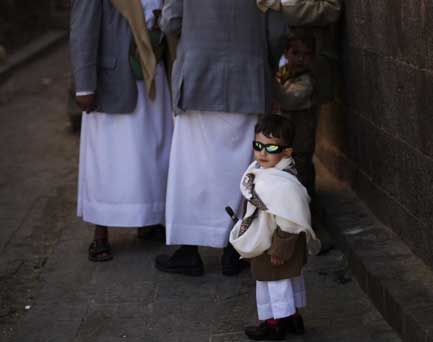 Seorang bocah muslim terlihat gembira dalam merayakan hari raya Idul Adha di Yaman