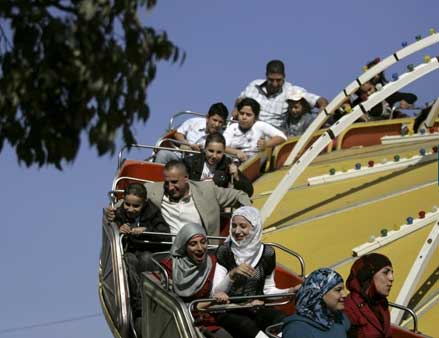 Warga Palestina di Tepi Barat menikmati hiburan yang ada di salah satu pusat hiburan di Ramallah selama libur Idul Adha