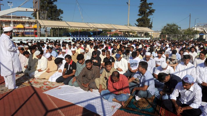 Umat Muslim melakukan shalat Idul Fitri di tempat terbuka di Yunani, dalam sebuiah pertemuan yang "diizinkan oleh otoritas", di negara Eropa satu-satunya tanpa masjid resmi.