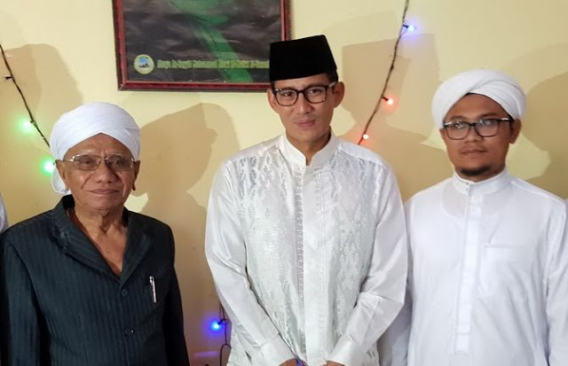 KH. Ismail Fathul Bari (kiri) dan KH. Muhammad Ashim Ismail (kanan) foto bareng Cawapres 02 H. Sandiaga S. Uno[/caption]