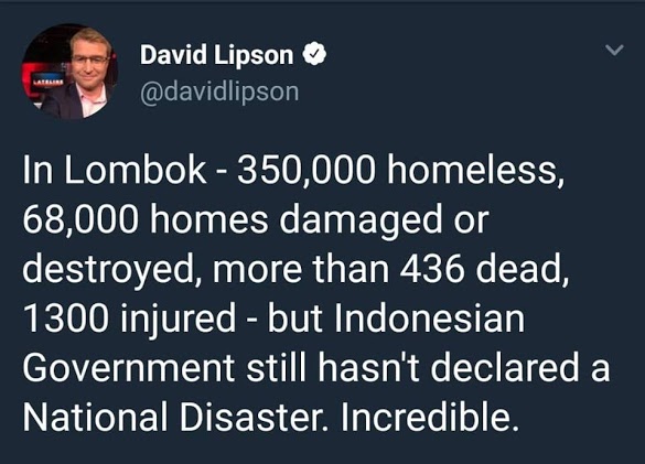 "Di Lombok - 350.000 orang kehilangan tempat tinggal, 68.000 rumah rusak atau hancur, lebih dari 436 meninggal, 1300 terluka - tetapi Pemerintah Indonesia masih belum mendeklarasikan Bencana Nasional. Luar biasa," tulis David Lipson di akun twitternya @davidlipson, 15 Agutus 2018.
