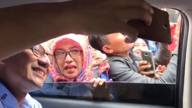 Eramuslim.com - Seorang wanita terlihat menangis saat meminta foto selfie bersama calon wakil presiden nomor urut 02, Sandiaga Uno.