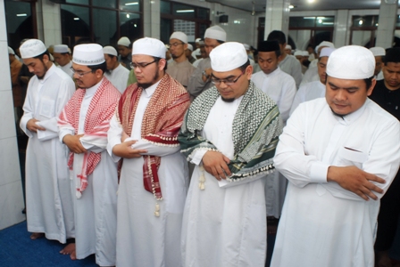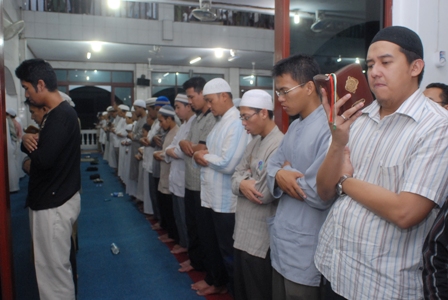 Tampak dalam gambar, seorang jama'ah sedang asyik menyimak bacaan imam sholat, sementara gambar lain menunjukkan jama'ah memenuhi setiap sudut masjid. (M. Zakir Salmun)