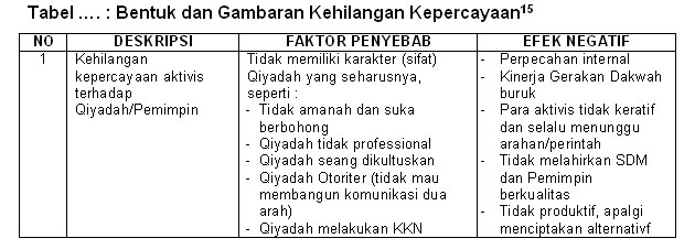 Satu hal yang perlu dicatat ialah, jika aktivisnya mengelami krisis kepercayaan pada qiyadah (pememimpin) mereka dan begitu pula dengan sesama Gerakan Dakwah jiuga mengalami krisis kepercayaan, bagaimana mungkin Gerakan Dakwah mampu menanamkan keprcayaan pada para pemimpin atau penguasa negeri-negeri Islam serta masyarakat Muslim yang masih belum yakin pada syumuliyatul Islam (komprehesnivitas Islam)? Apalagi jika mereka melihat para tokoh Gerakan Dakwah masih suka dan tertipu oleh kemilau duniawi yang menjadi tujuan hidup matinya para penguasa.