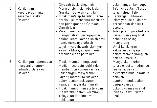 Para aktivis dan sebagian tokoh yang masih komitemen dengan nilai dan semangat dakwah mengalami kehilangan kepercayaan terhadap para pemimpin dakwah yang kurang professional dan bahkan menyimpang. Kondisi seperti ini telah melahirkan fiksi, perpecahan, atau paling tidak perang dingin internal.