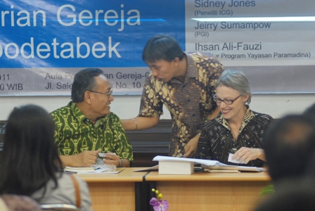Diskusi ini menghadirkan narasumber: Ahmad Syafii Mufid (FKUB DKI Jakarta), Sidney Jones (International Crisis Group), Jeirry Sumampau (Persatuan gereja-gereja Indonesia) dan Ihsan Ali-Fauzi (Direktur Program Yayasan Paramadina, ketua tim peneliti).