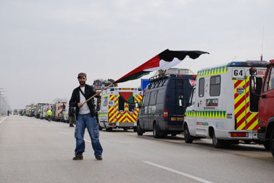 Konvoi yang dipimpin oleh mantan anggota parlemen Inggris George Galloway, diselenggarakan oleh Viva Palestine Movement.
