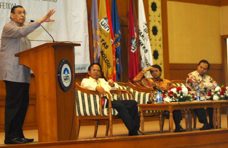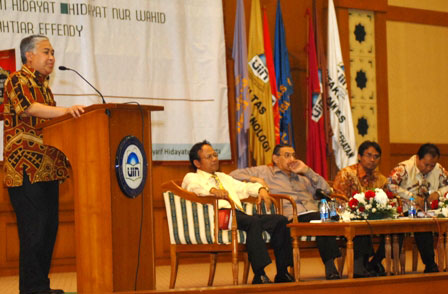 Tidak seperti biasanya, pagi tadi (23/2) auditorium Universitas Islam Negeri(UIN)Jakarta dipenuhi oleh mahasiswa dan tokoh-tokoh Islam. Ada apa gerangan? Ternyata pagi itu ada acara yang cukup bagus temanya "Membumikan Al-Qur'an", yang merupakan buku karya Quraish Shihab.