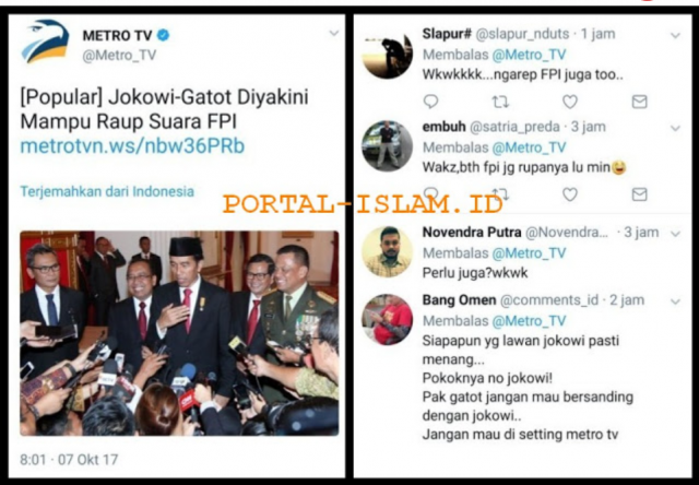 Eramuslim.com -Berita MetroTV berjudul “Jokowi-Gatot Diyakini Mampu Raup Suara FPI” ditertawakan netizen.