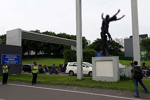 Eramuslim – Sebuah patung yang memperagakan adegan ‘porno’ di Surabaya, Jawa Timur, membuat heboh sebagian masyarakat. Pasalnya, Lokasi patung kontroversial ini terletak di sekitar kampus Universitas Negeri Surabaya (UNESA) Kampus Lidah Wetan, kawasan PTC, Surabaya.
