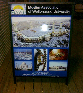 Semakin bertambahnya jumlah mahasiswa muslim yang belajar di kampus ini menyebabkan pihak universitas harus menyediakan fasilitas beribadah bagi umat Islam. Oleh karena itu, dibangunlah sebuah bangunan (mirip ruang kuliah) didalam kampus yang digunakan menjadi sebuah masjid. Abubakar Mosque, itulah nama masjid yang berada didalam kampus UoW. Masjid ini tidak hanya digunakan untuk sholat, tetapi juga digunakan untuk melaksanakan pengajian, mempelajari Al-quran, dan bertukar fikiran tentang Islam antar mahasiswa dari seluruh bangsa didunia yang sedang menempuh studi di UoW. Seluruh kegiatan tersebut diatur dan dilaksanakan oleh MAWU, yang merupakan kependekan dari Muslim Association of Wollongong University. MAWU adalah perkumpulan mahasiswa dan mahasiswi muslim dari berbagai negara yang sedang kuliah maupun melakukan riset di UoW.