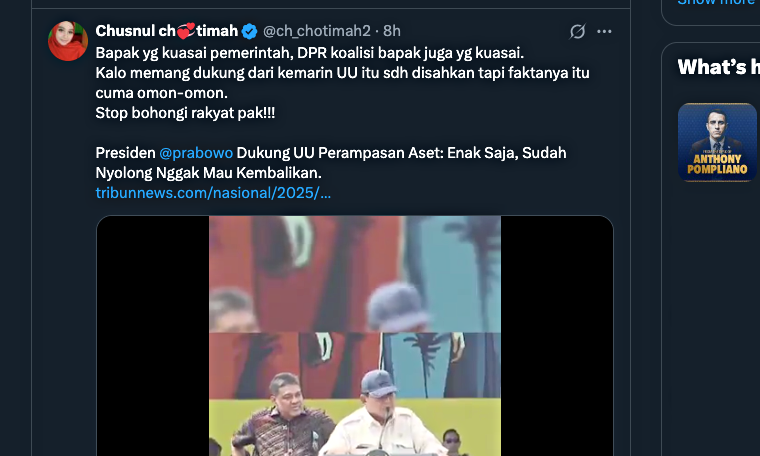 "Bapak yang kuasai pemerintah, DPR koalisi bapak juga yang kuasai. Kalo memang dukung dari kemarin UU itu sdh disahkan tapi faktanya itu cuma omon-omon," kritik Chusnul, dilansir X @ch_chotimah2 (1/5).