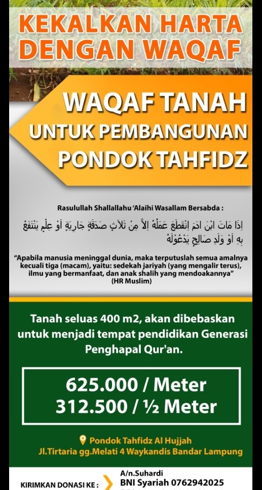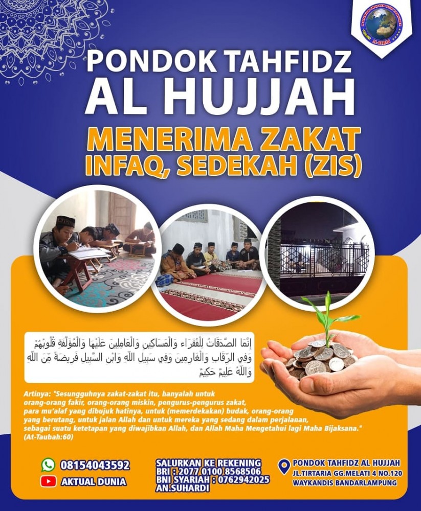 Pondok Tahfidz Al Hujjah, yang berlokasi di Jln. Tirtaria Waykandis Bandarlampung, mengajak para muhsinin, untuk bersama-sama kami dalam perjuangan mencetak generasi penghapal Qur'an. Sisihkan sedikit rezeki yang Allah berikan, maka yang sedikit itu akan menjadi pemberat timbangan kebaikan kita di hadapan Allah kelak.