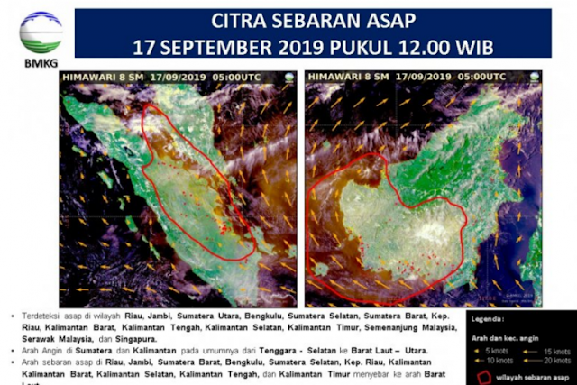 Eramuslim.com - Badan Meteorologi Klimatologi dan Geofisika (BMKG) mendeteksi sebaran asap akibat kebakaran hutan dan lahan di Sumatera mencapai Singapura dan Semenanjung Malaysia. Informasi dari laman BMKG yang diperbarui pada Selasa (17/9) pukul 12.00 WIB, dilaporkan asap lintas batas juga terpantau dari Kalimantan Barat ke Serawak Malaysia.