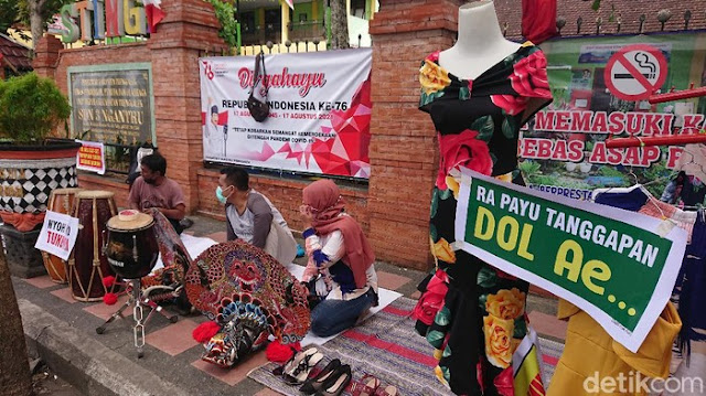 "Ayo ayo ayo mangga bapak-bapak ibu-ibu, yang butuh sepatu, baju atau barongan silakan dibeli. Tak dol kabeh (saya jual semua) yang penting dapat duit buat beli beras," teriak salah seorang pekerja seni, Dilla, Sabtu (21/8/2021).