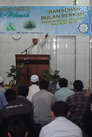 Untuk memenuhi kebutuhan masyarakat yang haus tentang ilmu puasa, Jum’at malam(15/7)pengurus masjid AlHikmah Bangka II, Jakarta Selatan menggelar acara Tarhib Ramadhan dengan menampilkan dua ustadz, yang memiliki pesantren AlQur’an yaitu: KH. Abdul Hasib Hasan(Pimpinan Ponpes Darul Qur’an, Serpong)dan KH. Muslih Abdul Karim(Pimpinan Baitul Qur’an, Depok).