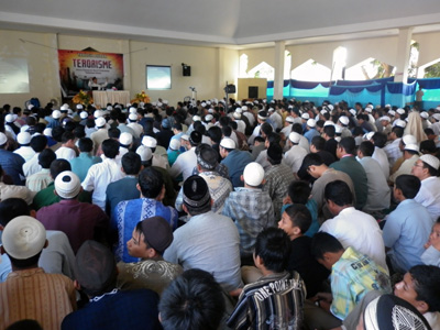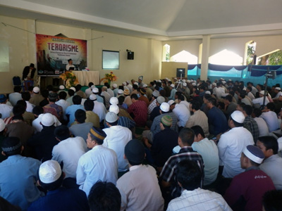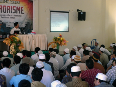Ustadz kemudian memaparkan tentang terorisme mulai dari makna, tanda-tanda dan sebab-sebab terjadinya aksi teror serta kelihaian barat dalam berkonspirasi untuk memberikan stigma teroris kepada kaum muslimin. Padahal mereka yang jelas-jelas melakukan tindakan kejahatan tidak dikatakan sebagai teroris. Beliau memberikan contoh-contoh aksi teror di luar negeri seperti Israel terhadap rakyat Palestina dan di dalam negeri seperti pengeboman masjid kantor polisi di Cirebon saat akan melaksanakan shalat Jum’at dan pengeboman di beberapa tempat lainnya. Ustadz yang juga salah satu pengurus MUI pusat ini kemudian menegaskan, “Islam bertentangan dengan terorisme, karena Islam tidak menghalalkan segala cara. Jihad atau perang di jalan Allah dalam Islam tidak bisa disamakan atau dijadikan pijakan untuk melakukan aksi teror. Jihad adalah suatu syariat agung dengan syarat dan aturan yang sangat ketat dan manusiawi.”